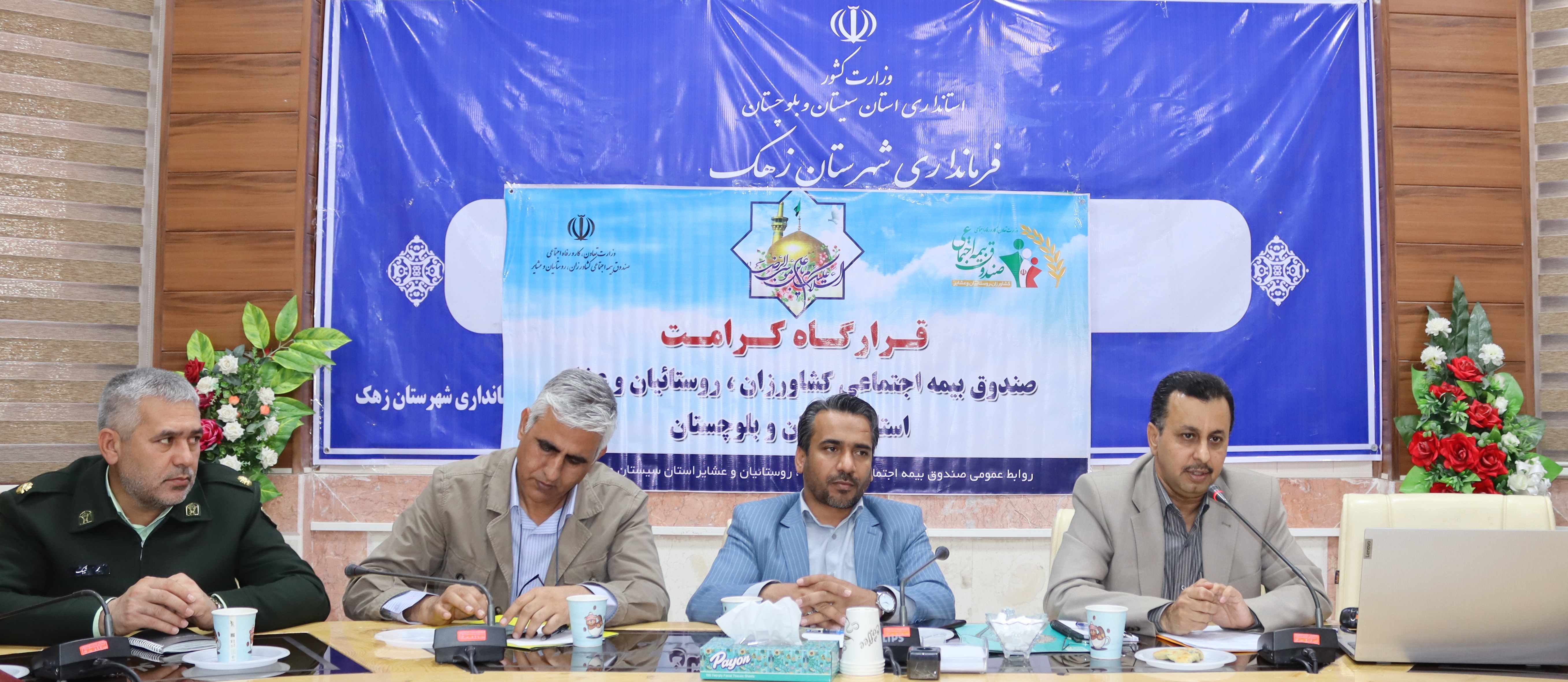 نشست قرارگاه کرامت و ستاد توسعه بیمه اجتماعی کشاورزان، روستائیان و عشایر شهرستان زهک با حضور خداداد اولیایی مدیر بیمه اجتماعی کشاورزان، روستائیان و عشایر استان سیستان و بلوچستان، حسن دهمرده فرماندار زهک، بخشداران، دهیاران و مدیران دستگاههای اجرایی شهرستان در محل سالن اجتماعات فرمانداری برگزار شد.