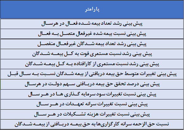 جدول 1: پارامترهای موثر در جدول تراز مالی صندوق بیمه اجتماعی کشاورزان، روستاییان و عشایرمدیر کل آمار و محاسبات بیمه ای صندوق ضمن اشاره به محاسن این مدل ریاضی – آماری، گفت: قابلیت پیشبینی بیمهشده فعال، بیمهشده غیرفعال متصل و منفصل، مستمریبگیر سالمندی، مستمریبگیر بازنشسته پیش از موعد، مستمریبگیر از کار افتاده، مستمریبگیر فوت، مجموع حقبیمه پرداختی سهم بیمهشدگان، حقبیمه پرداخت شده سهم دولت، درصد تحقق حقبیمه پرداختی سهم دولت، سود (نقدی) خالص سرمایهگذاریها، هزینه تعهدات، هزینه تشکیلات، حق الزحمه کارگزاری ها، نسبت پشتیبانی و در نهایت پایداری، تعادل منابع و مصارف صندوق و به تعبیری گویای تراز مالی صندوق به تفکیک و بصورت سالانه و سر جمع ( تا سال 1415 ) را دارا میباشد.